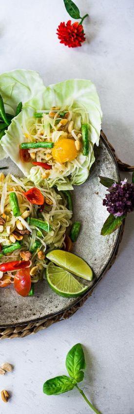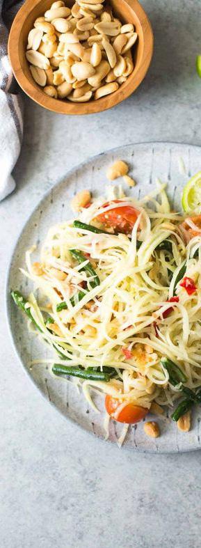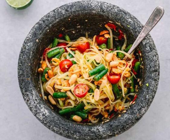 Nguyên liệu • 2 tép tỏi • 5 quả ớt Thái • 2 thìa đậu phộng rang bỏ vỏ • 1 muỗng canh nước mắm • ½ - 1 thìa đường cọ • 1 - 2 quả chanh • 1 thìa tôm khô • 1 - 2 quả cà chua nhỏ • 1 nắm lớn đu đủ xanh thái sợi • Đậu dài hoặc đậu xanh • Bắp cải xanh • Húng quế ngọt kiểu Thái • Lạc rang