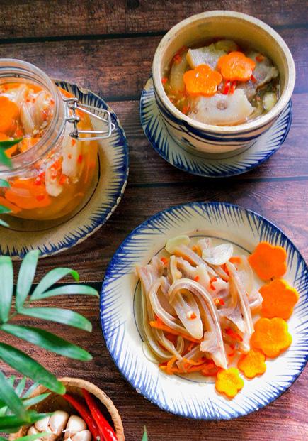 5. Tiếp đến cho phần rau thơm thái nhỏ vào trộn nhẹ nhàng, từ từ rưới phần nước mắm trộn nộm. Pha mắm trộn nộm: 2 muỗng canh nước cốt chanh tươi, 2 muỗng canh đường, 3 muỗng canh nước mắm, 1 muỗng cà phê bột canh cùng tỏi, ớt băm nhỏ.