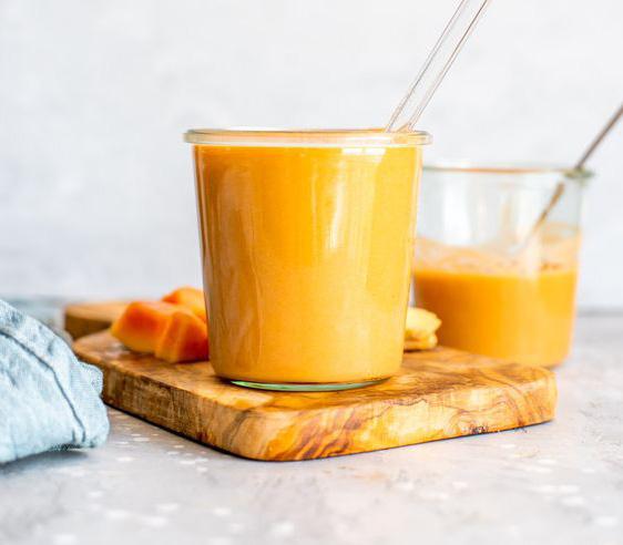 3. Cho vào máy xay sinh tố đu đủ và gừng đã cắt. Đổ thêm 100ml sữa tươi vào trong máy xay. Xay nhuyễn các nguyên liệu lại với nhau rồi tắt máy, rót ra ly thưởng thức nhé.