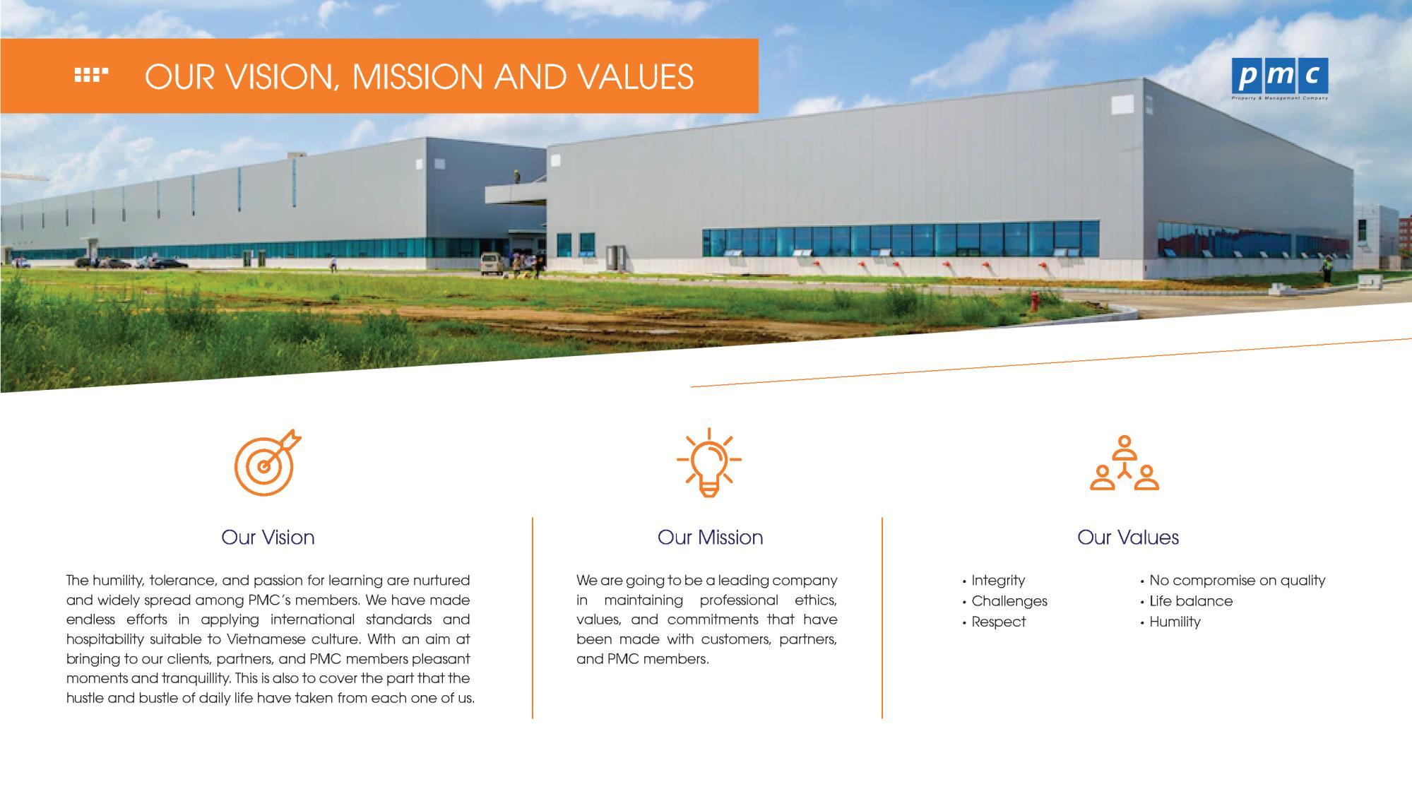 Chúng tôi sẽ là công ty đi đầu trong việc duy trì các chuẩn mực đạo đức nghề nghiệp, các giá trị và cam kết đã được tuyên bố với khách hàng, đối tác và thành viên PMC.