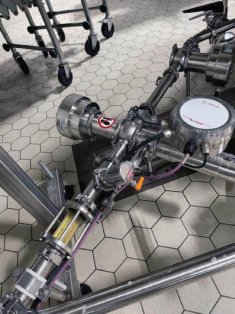 Setting aside the canning line inputs, the beer itself is pressure piped into the packaging hall. Immediately before entering the filler, the beer is analyzed in-line via a nifty Anton Paar beverage analyzer. The equipment for dissolved oxygen (DO), CO2, liquid density, and calculates the precise alcohol by volume percentage. This isn’t a common step for craft breweries at Market Garden’s volume, demonstrating the company’s commitment to quality.