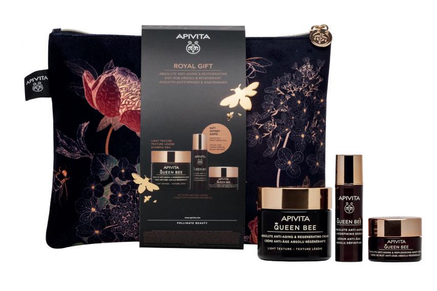 El nuevo trat amiento QUEEN BEE ofrece una rutina complet a de cuidado facial con un contorno de ojos revit alizante, un sérum redensificante, una crema regeneradora en dos texturas adapt adas a cada tipo de piel y una crema de noche reconstituyente para una transformación antiedad absolut a de la piel en solo 8 días APIVITA, fiel a sus compromisos, ofrece productos eficaces con hasta un 97 % de origen natural , dermatológicamente test ados, seguros para la piel, para el planet a y para las abejas y fabricados de forma sostenible con embalajes reciclados y reciclables