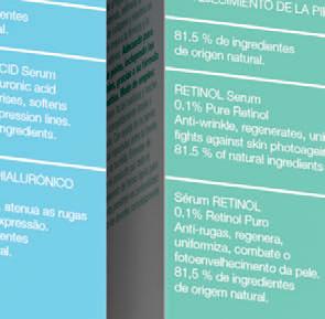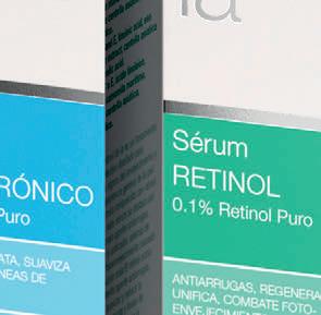 Una línea formulada para combatir la pérdida de rmeza y de elasticidad de la piel. Está formulada con Colágeno, Retinol, complejo liposomado Ameliox (a base de Carnosina, extracto de Cardo Mariano y Vitamina E), Ácido Hialurónico puro, Células madre vegetales, Extracto de regaliz y Vitamina E. Una combinación de activos que combate las arrugas, aporta rmeza, uni ca el tono y mejora la textura de la piel. También posee propiedades despigmentantes y antiglicación. Gama: crema facial 50 ml, contorno de ojos 30 ml, sérum facial 30 ml, gotas concentradas 15 ml.