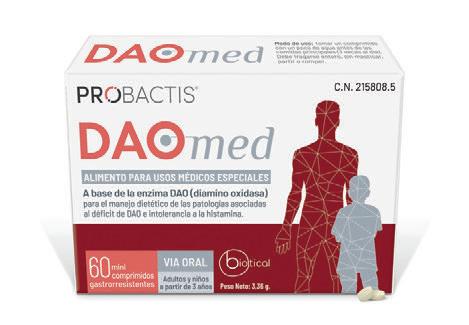 El nuevo Probactis DAOmed ® proporciona la enzima DAO necesaria para mejorar la capacidad del organismo de descomponer la histamina de manera e ciente, reduciendo los síntomas asociados al décit de DAO e intolerancia a la histamina. Basado en evidencia cientí ca y clínica con los más altos requisitos de calidad en nutrición médica.