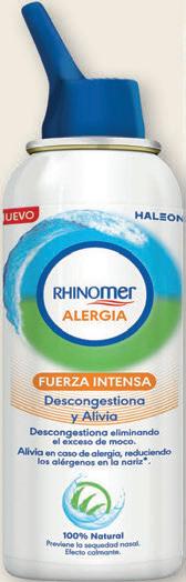 La formulación de Rhinomer Alergia contiene agua de mar purificada y polvo de aloe vera, actúa limpiando las fosas nasales cuando la nariz está congestionada, por ejemplo, durante un episodio alérgico, eliminando, mediante el lavado del exceso de moco, las partículas de alérgenos tales como polvo o polen, que pueden ser desencadenantes de problemas de alergia. Además, gracias a su fuerza intensa, proporciona un lavado profundo. Diseñado para su uso en personas adultas y con una frecuencia habitual de empleo de 1 o 2 veces al día, si bien debido a su composición 100% natural se puede utilizar tantas veces como sea preciso.