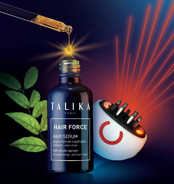 Inspirada en el tratamiento para el crecimiento de las pestañas de Talika, que pronto cumplirá 75 años, Hair Serum es una loción ultra na, no grasa ni pegajosa, que envuelve ligeramente la raíz del cabello para que éste parezca más grueso. Para optimizar la penetración del suero en el cuero cabelludo, se puede usar el Hair Booster Led, un digno heredero del Light 590