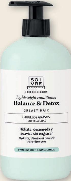 El nuevo acondicionador ligero, gra cias a su textura líquida y sedosa, hidrata, desenreda y suaviza el cabello sin apelmazarlo ni engrasarlo. Está formulado con Symcontrol®, un activo seborregulador patentado que contiene microalgas que regulan la producción de sebo. Además, contiene Niacinamida, una vitamina hidrosoluble y de bajo peso molecular que actúa como seborregulador, calmante y antiin amatorio. La sinergia de estos dos activos indicados para regular el exceso de grasa unidos a los agentes hidratantes hacen que el cabello quede suave y sedoso sin engrasar el cuero cabelludo y ayudando a controlar el sebo. Vegano. Sin sulfatos. Presentación 500 ml.