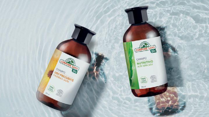 Seis champús y una mascarilla con certi cado COSMOS Organic dan solución a todas las afecciones de cabello y cuero cabelludo. Los extractos naturales de los champús de Corpore Sano limpian y protegen el cuero cabelludo y el cabello, aportando sus propiedades para mejorar las distintas afecciones como la caspa, la grasa o la sequedad. La mascarilla capilar, con Aceite de Argán bio y Altea, hidrata la bra capilar y proporciona nutrientes. Las fórmulas con ingredientes naturales y orgánicos se han elaborado evitando tanto el