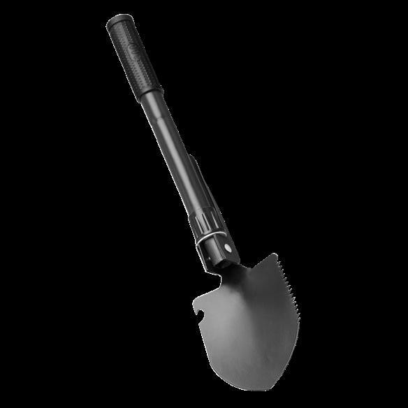 Jeklena zložljiva lopata v etuiju, primerna za kampiranje ali kot orodje v vozilu. Sestavlja jo kramp, lopata z odpiračem in