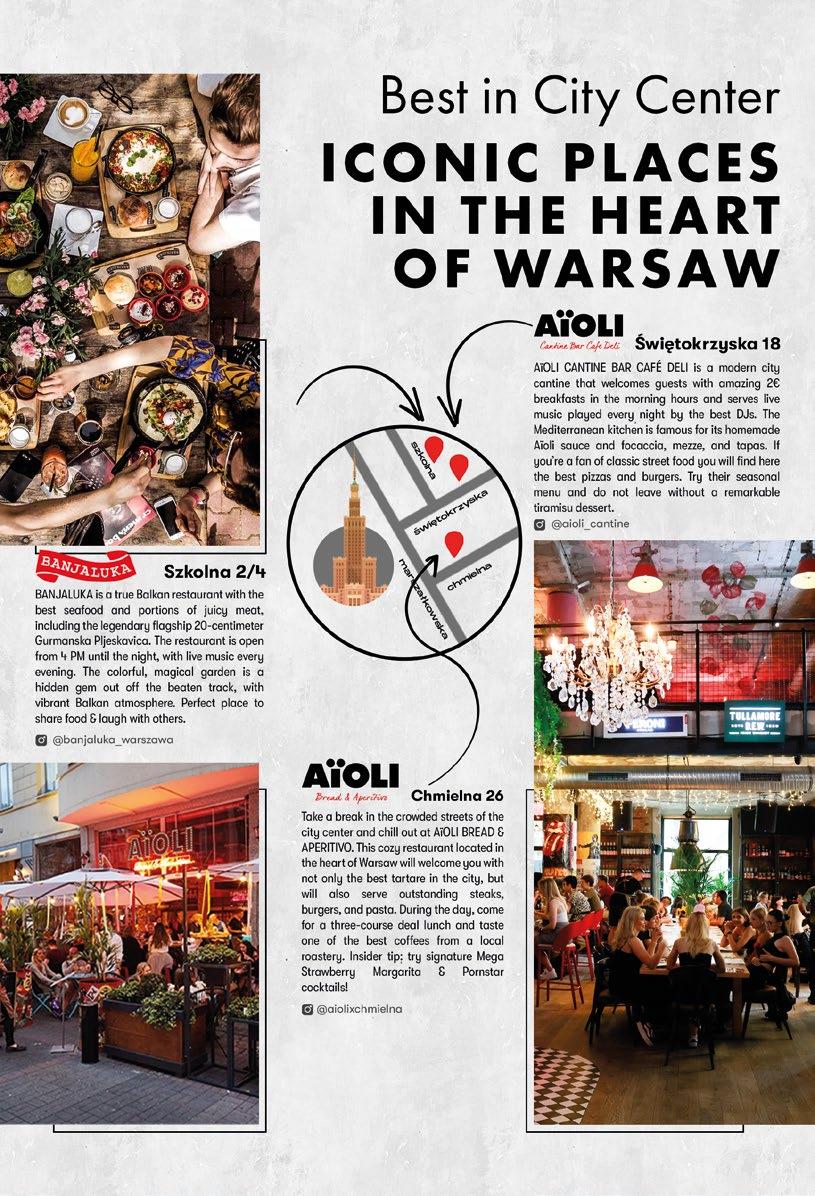 master on the culinary scene of Warsaw). Find more incredible dishes at Dym and Ivy Lounge, tasty Spanish food at Tres Toros, real American meat at Prime Cut & Cigar Room and still more excellent Polish and Ukrainian dishes at the popular Milk Bar.