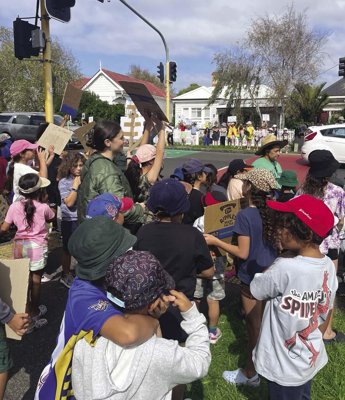 P39 - Chlöe Swarbrick stands with tamariki from Richmond Road School in Ponsonby during the School Strike 4 Climate in April.
