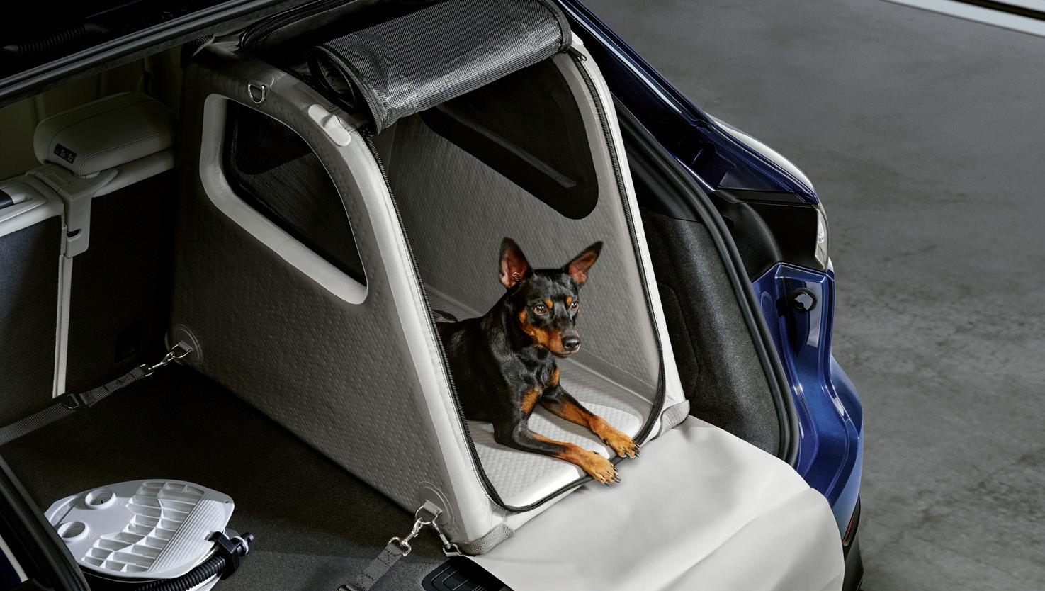 Mit der aufblasbaren Porsche Kofferraumbox können Hunde verschiedener Größen einfach und sicher transportiert werden. Inkl. Gurte zur Fixierung der Box.