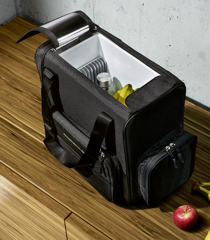 Schwarze Kühltasche mit ca. 14 Liter Volumen und „PORSCHE“ Schriftzug. Mit 12-VoltAnschluss zur Kühlung von Getränken und Speisen im Fahrzeug.