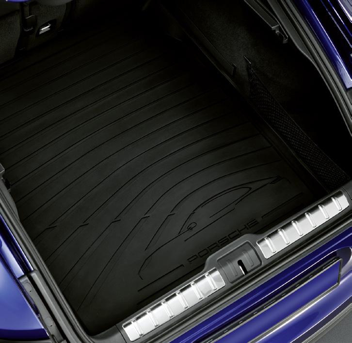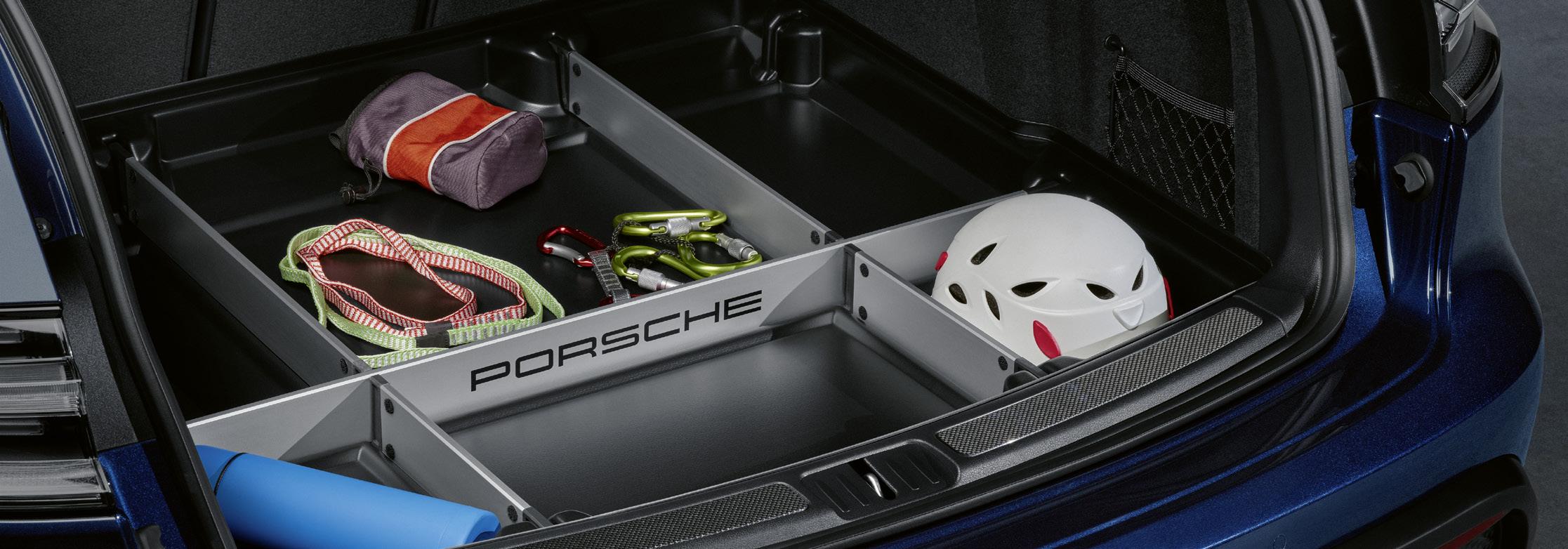 Die Kofferraumwanne mit variablem Organizersystem bietet maßgeschneiderten, rutschfesten Schutz und sorgt mit dem „PORSCHE“-Schriftzug für einen eleganten Look. Dank der wasserundurchlässigen, abwaschbaren Oberfläche und verstellbaren Trennelementen wird der Transport von Gegenständen sicher und komfortabel – der verschließbare Deckel erleichtert zudem das Be- und Entladen.