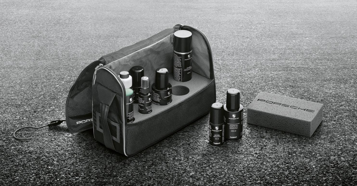 Optimal abgestimmte Pflegeserie in einer praktischen Tragetasche mit Zubehör. Enthält hochwertige, speziell für Porsche Fahrzeuge freigegebene Pflegeprodukte für das Interieur und Exterieur des Fahrzeugs. Der Inhalt umfasst Insektenentferner, Wasch-Shampoo, Lackpolitur, Hartwachs, Scheibenreiniger, Innenscheibenreiniger, Lederpflege, Tücher, Schwämme und Fensterleder.