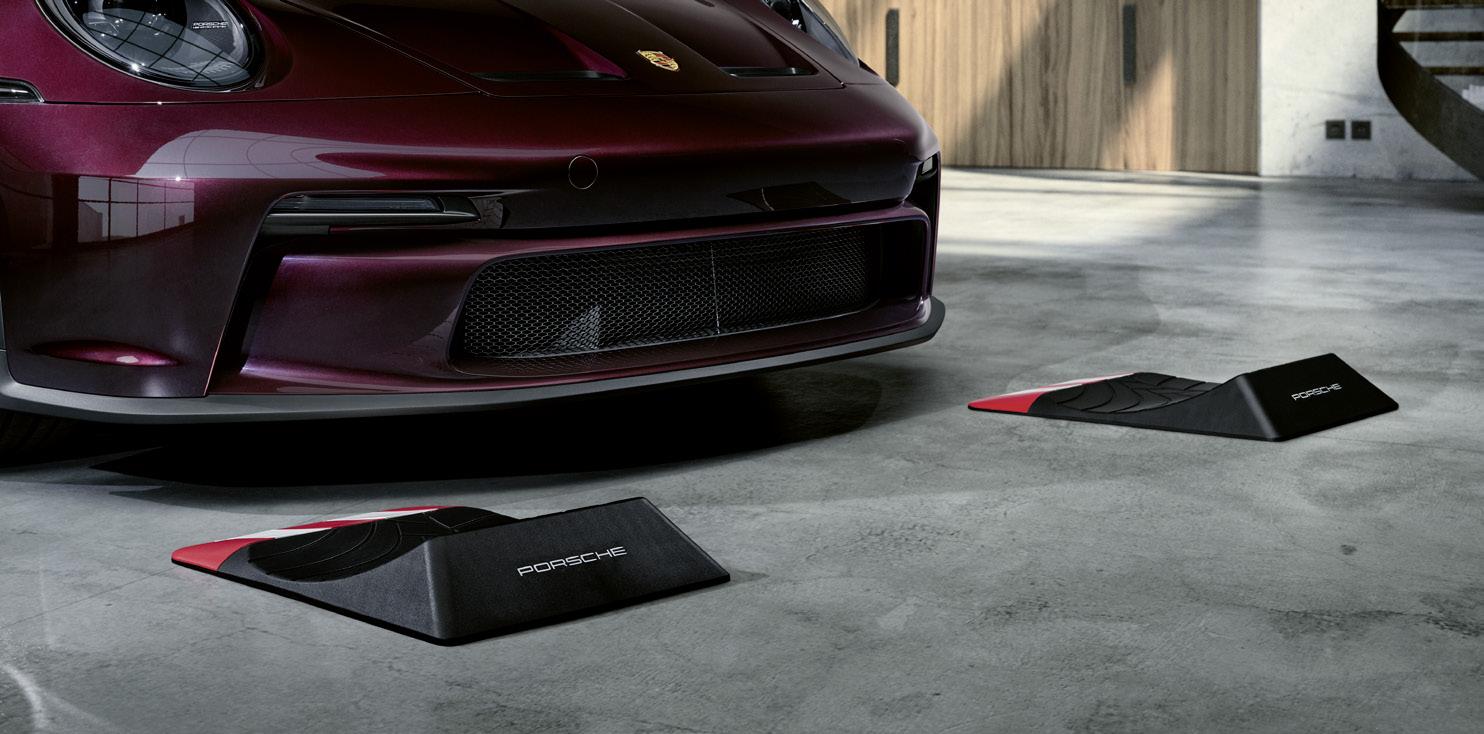 Die ParkDistance Pads mit rot-weißem Curb Design und „PORSCHE“-Schriftzug vereinen Ästhetik und Funktion. Durch das Auffahren auf die ca. 5 kg schweren Pads wird Ihr Fahrzeug sicher an der idealen Position abgestellt.