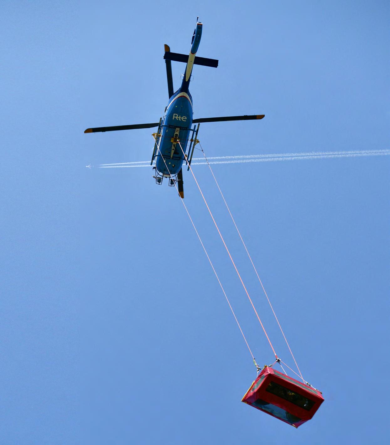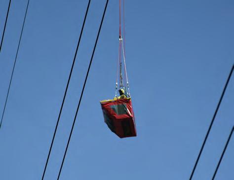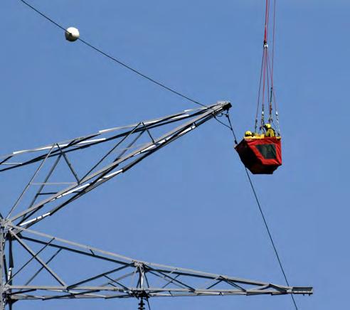 ungelend onder een helikopter zijn twee mannen staand in een trapeziumvormige gondel druk in de weer aan een hoogspanningslijn. Ze plaatsen bebakeningsbollen. Dat dit geen werk is voor watjes, is overduidelijk. Alleen al door de mannen zo hoog in de lucht bezig te zien, krijgen we natte handen. We zijn benieuwd naar het hoe en waarom van hun huzarenwerk.