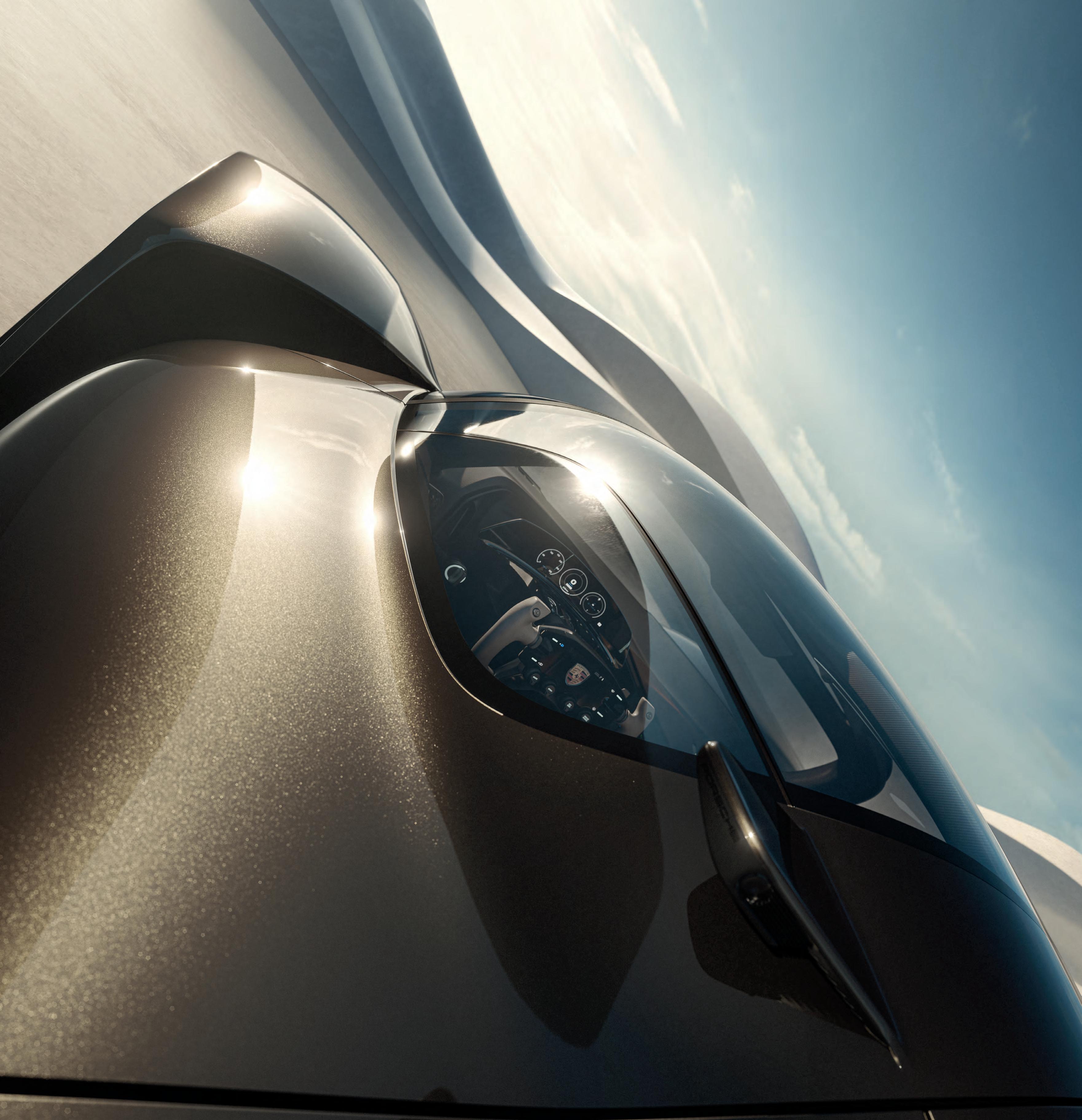 Porsche gebruikte dit principe ook bij de legendarische 917 raceauto. De karakteristieke vierpunts lichtsignatuur van Porsche komt terug in koplampen, die zijn geïnspireerd op de verticale lichtunits van historische raceauto’s als de 906 en 908. De LED-lichtmodules worden gedragen door een geavanceerde structuur waarin alle lichtfuncties samenkomen. Aan de achterzijde lijkt de lichtunit met de uitgeschreven en verlichte naam Porsche te zweven. Als het accupakket wordt geladen, pulseert de ‘E’ van de merkaanduiding.
