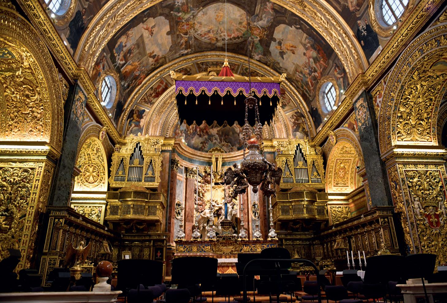 The city’s star attraction is St. John’s Co-Cathedral . Not much to look at from the outside, but once inside we are overwhelmed by a magnificent interior with a wealth of gold leaf, lapis lazuli and marble. Rarely have we seen such splendour and magnificence. The ceiling is covered with lavish frescoes depicting scenes from the life of John the Baptist, the patron saint of the city. They are painted so ingeniously that the longer we look at them, the more they seem to come to life. The marble floor is covered with tombstones with detailed coats of arms, symbols and inscriptions. Some 400 knights and clergymen are buried beneath them.
