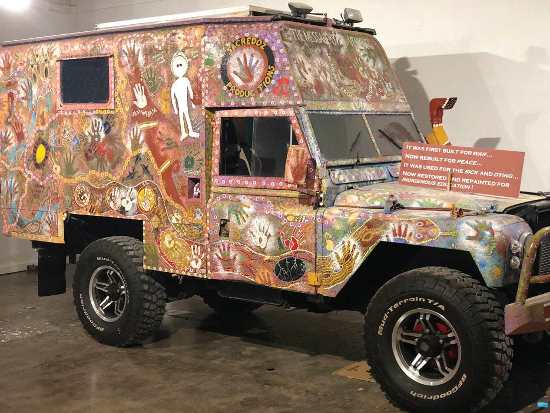 Michael zal jullie al wel verteld hebben over zijn Message Stick Vehicle -project waarbij hij gedurende tien jaar met een oude Land Rover door heel Australië reisde en de auto overal waar hij kwam liet decoreren door lokale Aboriginals. De auto staat nu in de Mitchelton Gallery of Aboriginal Art in Victoria. Het toeval wil dat er naast die auto een schilderij van mij hangt: The Lay of the Land . Zo kwam Michael bij mij terecht met de vraag of ik een ontwerp wilde maken voor het wrappen van een Porsche Cayenne. Ik beschouwde het als een nieuwe uitdaging. Ik ben de eerste Aboriginalartieste die een Porsche en een caravan van Jayco heeft mogen beschilderen. Daar ben ik best fier op.