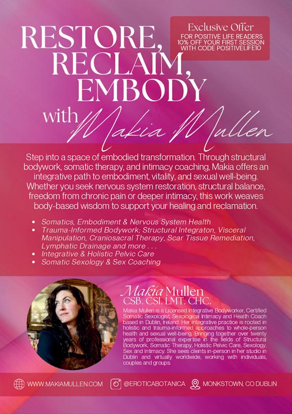 Ready to come home to your body? Makia Mullen offers a transformative approach to bodywork and healing for those navigating chronic pain, pelvic discomfort, scar tissue, and trauma. With over 20 years of experience, her integrative, traumainformed sessions support healing, vitality, and pleasure through techniques like somatic therapy, scar tissue remediation, and sexual wellness coaching. Whether in Dublin or virtually worldwide, Makia’s work is dedicated to helping you reconnect with your body’s wisdom, alleviate discomfort, and reclaim joy.