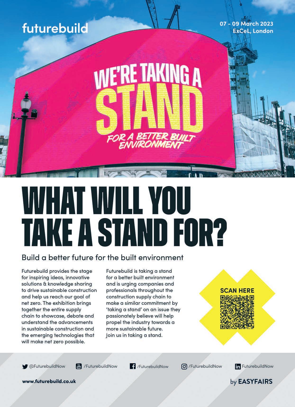 • Whatever rung on the ladder of the modern construction industry you are on, the opportunities afforded by the drive to sustainability can be sampled at Futurebuild in March. Everyone can metaphorically Take a Stand at ExCeL, where Construction National is once again proud to act as media partner. q
