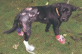 a badly infected front leg, a paw so badly crushed the bones had fused together and a stab wound.