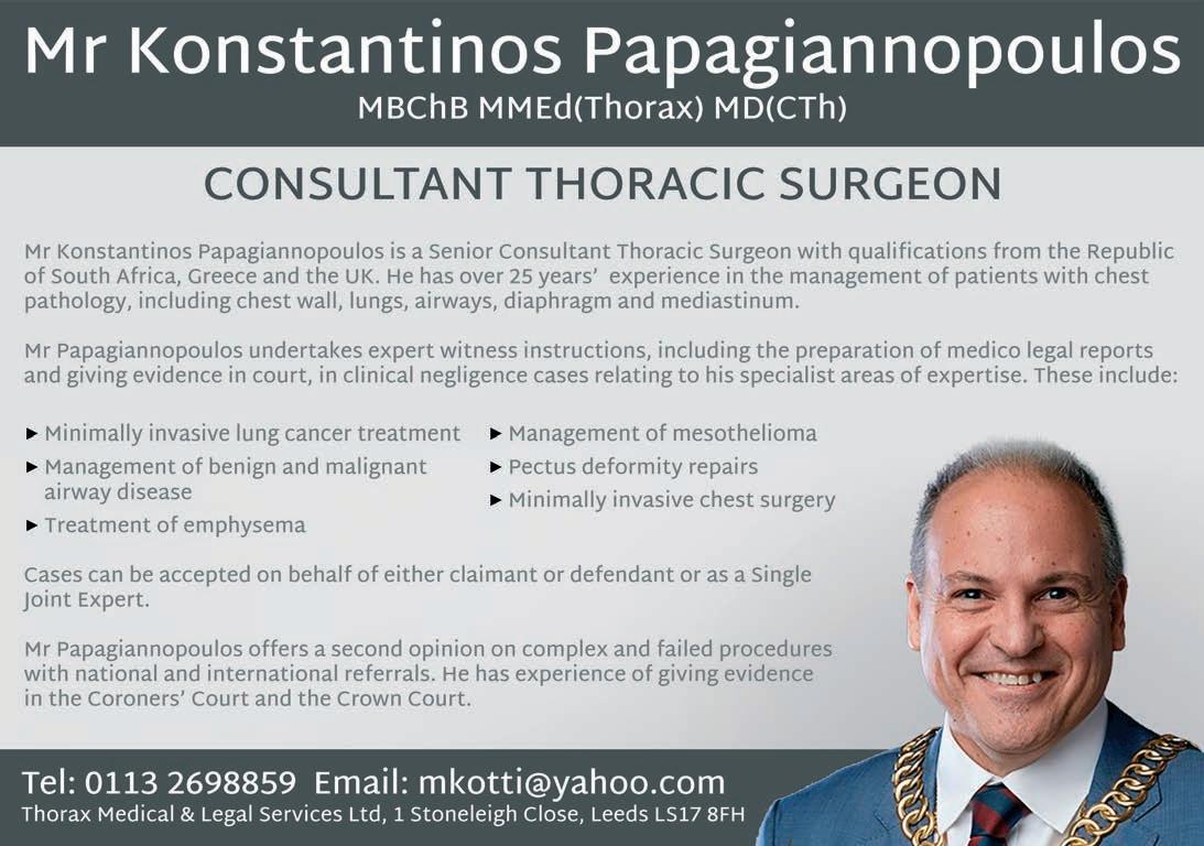 Mr Meleagros completes around 6-10 expert reports per month, the majority in medical negligence cases and a smaller number of personal injury cases. He has reported extensively on cases involving abdominal laparoscopy surgery and hernia surgery.