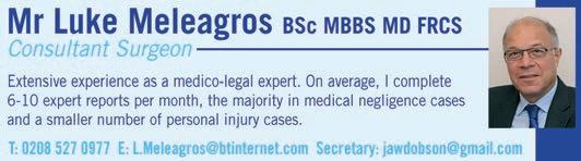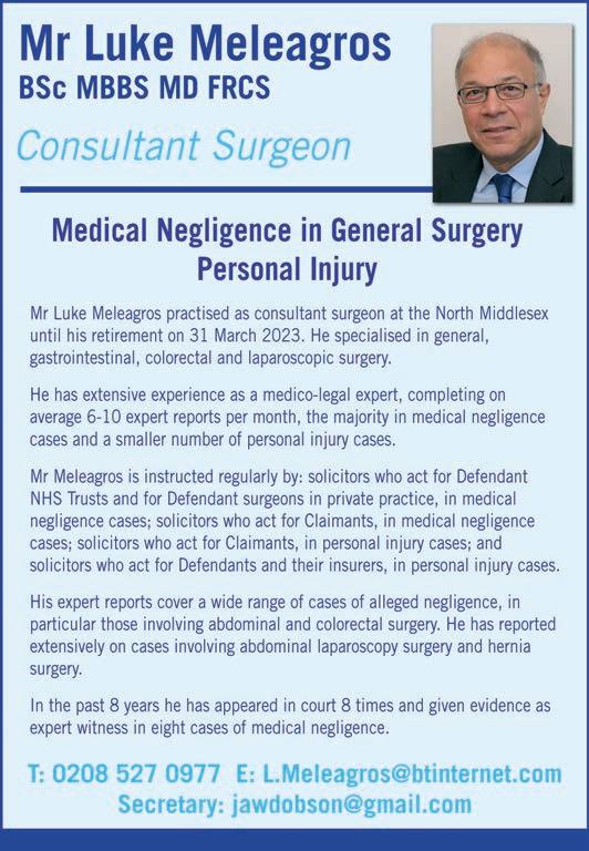 Mr Meleagros completes around 6-10 expert reports per month, the majority in medical negligence cases and a smaller number of personal injury cases. He has reported extensively on cases involving abdominal laparoscopy surgery and hernia surgery.