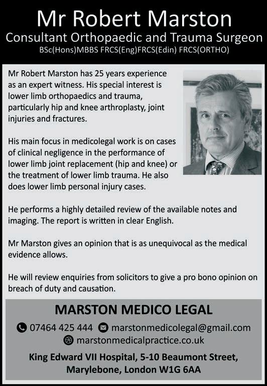 Mr Marston has 25 years experience as an expert witness. His special interest is lower limb orthopaedics and trauma, particularly hip and knee arthroplasty, joint injuries and fractures. His main medico legal work is with alleged clinical negligence. He also takes on selected personal injury cases.