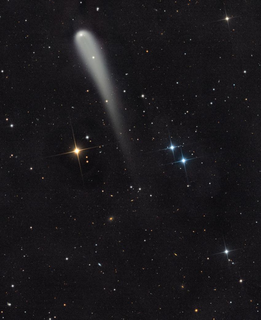 Le 9 janvier 2023 pour l’un et le 22 février de la même année pour l’autre, l’observatoire de la Montagne Pourpre (Tsuchinshan en mandarin), près de la ville de Nankin, en Chine, et l’Asteroid Terrestrial-impact Last Alert System (Atlas), un système de surveillance astronomique robotisé géré par l’institut d’astronomie de l’université de Hawaii, ont repéré indépendamment une nouvelle comète baptisée C/2023 A3 (TsuchinshanAtlas), venue du fond du nuage d’Oort. Elle a atteint son périhélie (le point de la trajectoire le plus proche du Soleil) le 27 septembre 2024. C’est donc à cette période que, chaleur oblige, l’objet céleste s’est paré d’une queue de gaz et de poussières le rendant possiblement visible depuis la Terre à l’œil nu, en fonction de son éclat apparent. Ce fut bien le cas, grâce notamment à plusieurs circonstances favorables : par exemple, début octobre, la queue bénéficiait d’un rétroéclairage solaire, et sa magnitude fut maximale le 9 de ce mois-là. Ce fut l’occasion pour beaucoup d’astronomes, amateurs ou non, de rivaliser en clichés spectaculaires, tel celui-ci, sélectionné par la Nasa. L’image a été prise à la fin mai 2024, lorsque la comète (en haut, page ci-contre) est passée presque devant deux galaxies lointaines (ci-contre et ci-dessous).