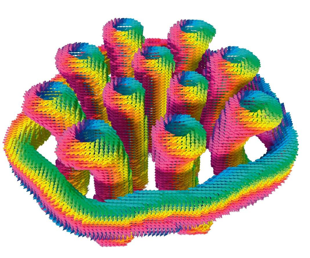 Dans certains matériaux, en influant sur les caractéristiques magnétiques d’ensembles d’atomes, il est possible de former des sortes de « bulles magnétiques » qui se déplacent très vite : des « skyrmions ». Ces objets ont une structure bidimensionnelle, mais en 2023, des physiciens ont créé pour la première fois leur pendant en trois dimensions : des « hopfions ».