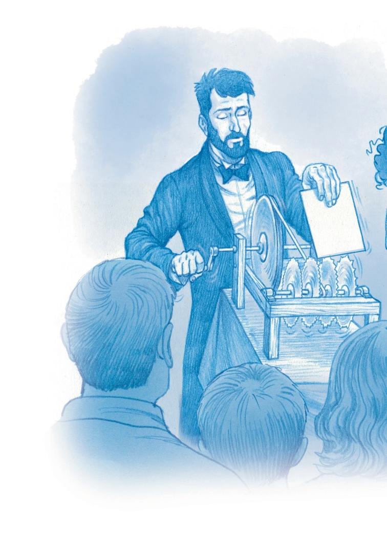 Dans la sirène de CagniardLatour, un flux d’air comprimé met en rotation un disque perforé placé au-dessus d’un autre, fixe celui-là. Le gaz, en étant alternativement bloqué ou libre de s’écouler, crée des variations de pression de l’air qui ne sont pas autre chose que des sons. Les compteurs placés au-dessus du dispositif indiquent le nombre de tours, et donc la fréquence. Air comprimé