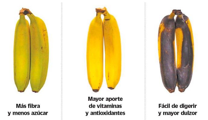 Tanto los plátanos verdes como los maduros son saludables y aportan las mismas kilocalorías. Sin embargo, mientras más maduros, menos aporte de pectina y de almidón resistente y más alto es el índice glucémico (velocidad con la que un alimento eleva la glucosa en sangre).