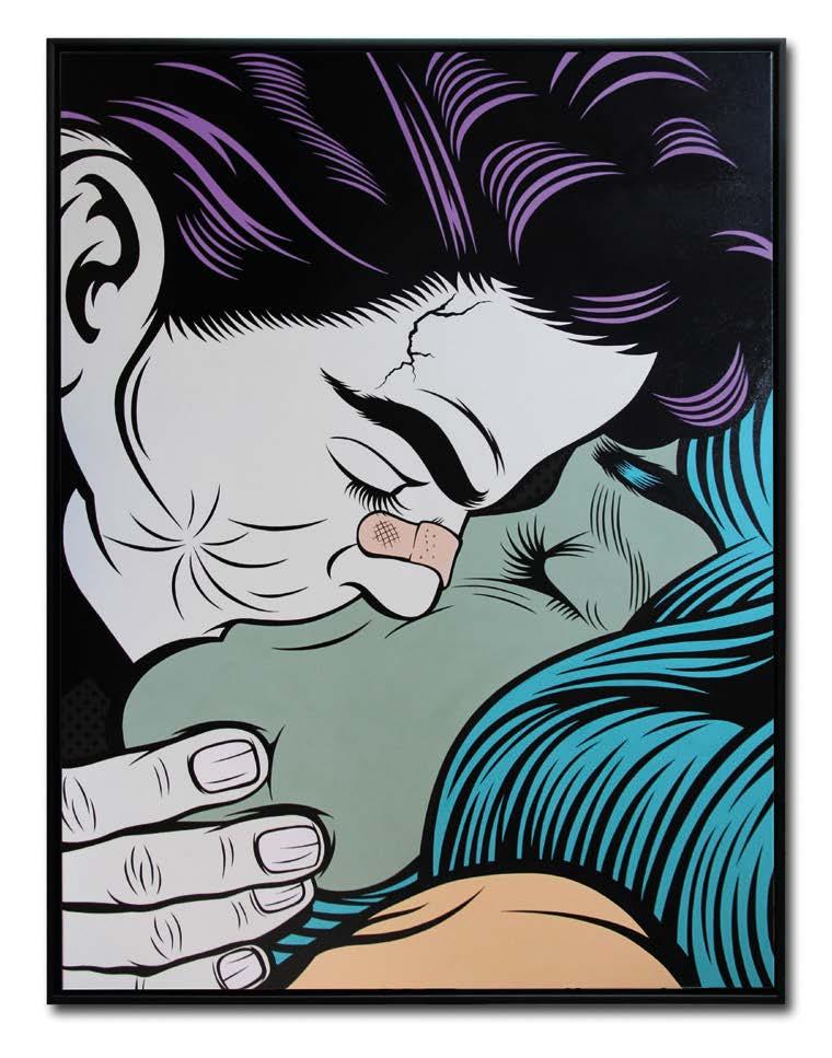 Two massive metal panels are arriving from “the shop.” They’re only a section of a much larger installation poised for art’otel London Hoxton. Up close, it’s difficult to discern what’s on them. Take a few steps back and the image on the panels slowly reveals itself: a panoramic collage of D*Face stickers. I ask Stockton what this is all about. “It started as that—” he says and tosses me a strip of paper decked out in his iconography “—that’s the original. It’s been scanned, printed out in large-format and we used that as our base. Then we block out all the colour, put black over the top, and go around to add in the shadows.” The shadows, he notes, are key.