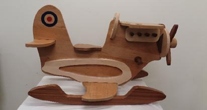 Did you know that we build airplanes in the Rooster Woodshop? Well, not exactly. What you see in the photos is a child’s rocker made to look like an airplane. There is a large flat surface above the modeled exhaust manifold that provides for a play surface or even a snack table. This would be a novel gift for a young child. It is featured in our showroom if you want to visit us and check it out.