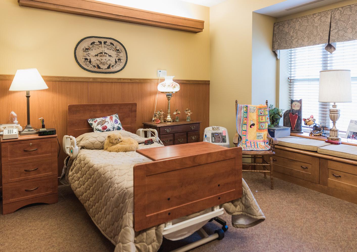 Accommodations in the Sturgeon Health Care Center are private and shared-private. An electric twin bed, night stand with lamp, recliner, dresser and closet are provided. A flat-screen television is attached to the wall for each resident.