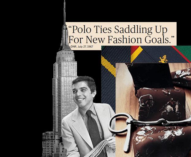 Ralph Lauren미국에서 가장 오래된 남성복 브랜드인 브룩스 브라더스의 점원으로 일하 던 랄프 로렌은, 엠파이어 스테이트 빌딩 쇼룸 한 켠에서 올드 할리우드에 서 영감을 얻어 고급 품질의 원단으로 직접 제작한 넥타이를 제작했다.