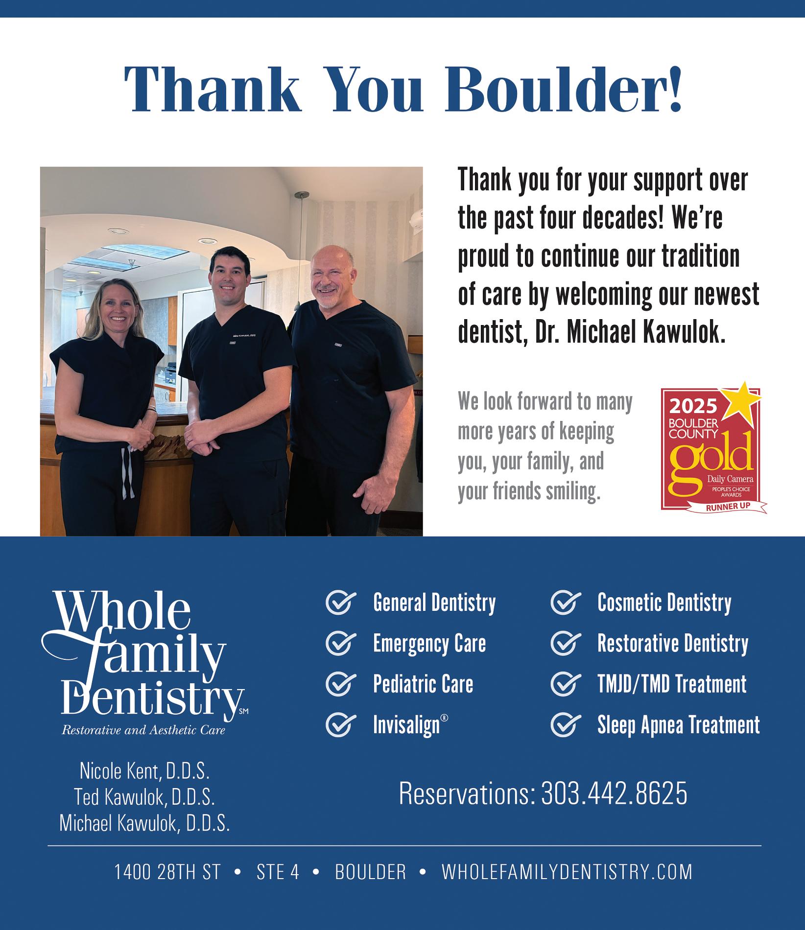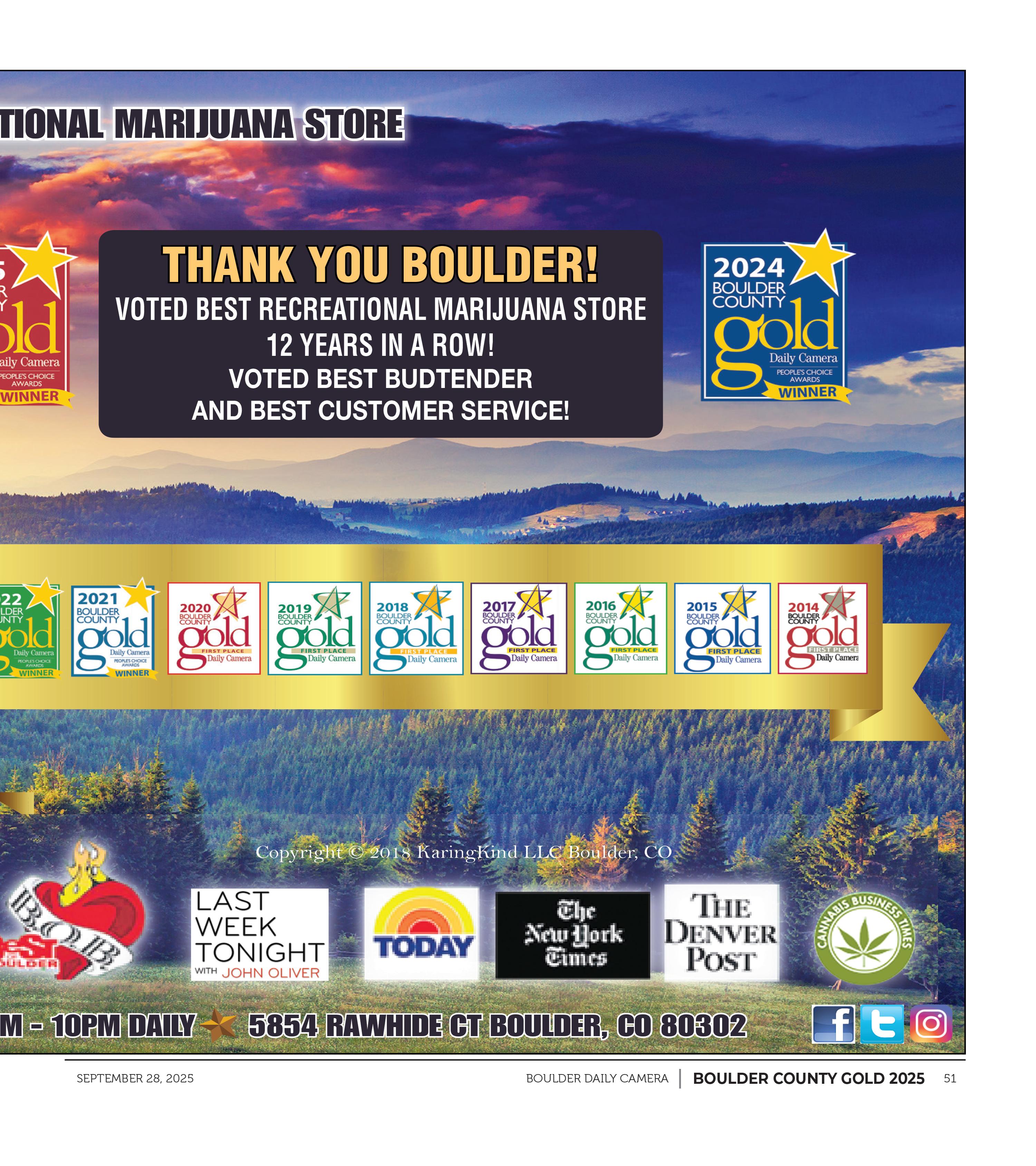 The results for the 2025 Boulder County Gold, Broomfield County Gold and Colorado Hometown Gold awards are in! As you explore the following pages, you’ll uncover the best of the best — restaurants, retailers, service providers and entertainment venues that make our region such a remarkable place to live These awards are determined by the residents of Boulder and Broomfield Counties, who know these businesses and individuals better than anyone. This year’s winners have once again demonstrated exceptional quality and dedication. Keep this guide handy throughout the year as your trusted resource. A heartfelt thank you to everyone who voted. Now, turn the page and get to know this year's outstanding winners!