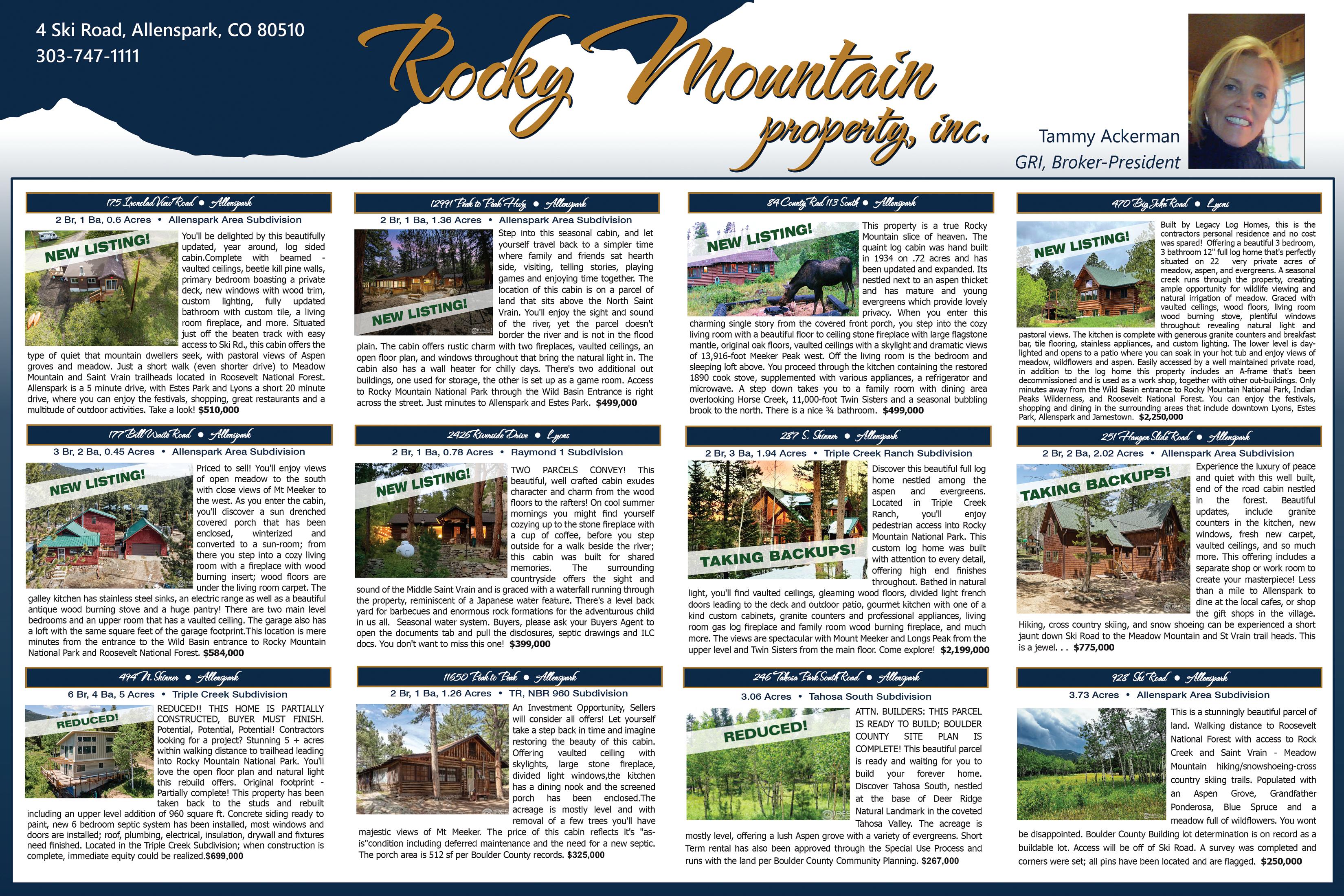 Historic Allenspark Livery (no longer in operation) located on the Business Route in Allenspark. 3parcels sold together total 2.17Acres includes4cabinswith year-round tenants. Opportunity to resurrect Livery business asproperty is ideally located for trail rides. Possible live/ work opportunities -consider storage unitswith workforce housing, community uses, or residential.