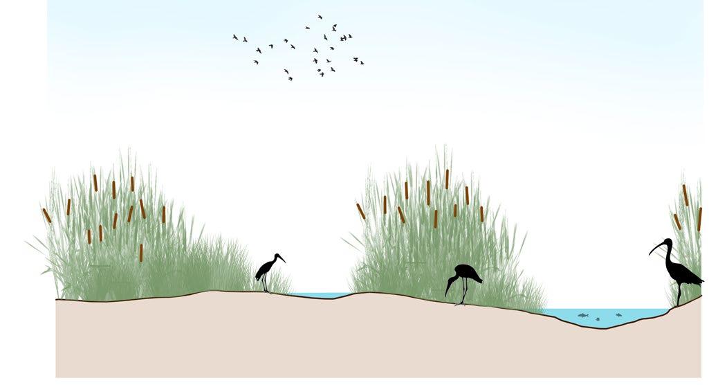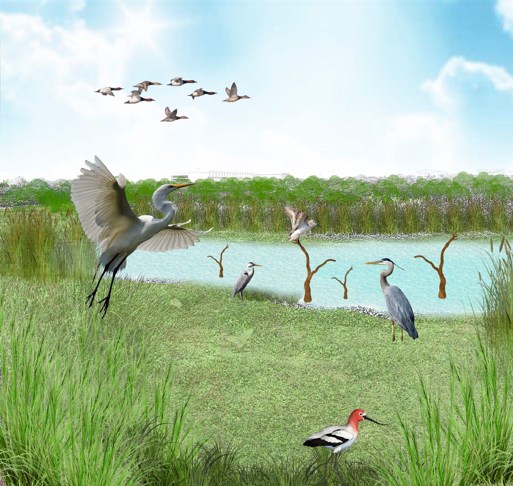 Island vegetation are proposed in the water body which acts as habitats and resting spaces for the birds and also for other semi-aquatic species residing in the marsh.