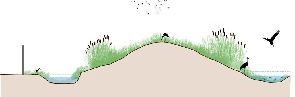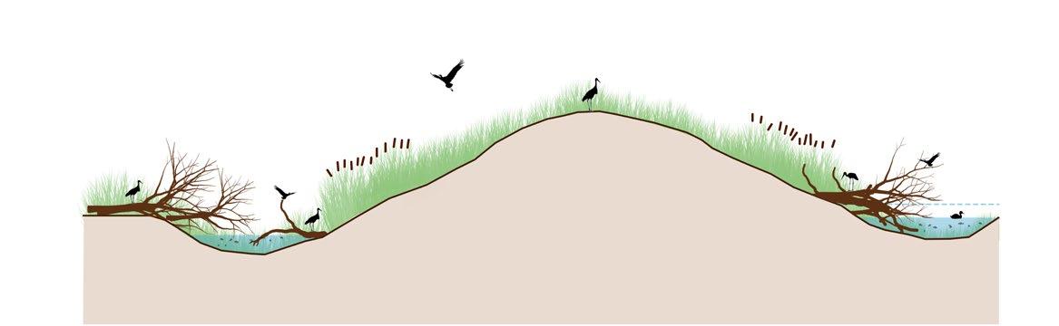 The vegetated mounds are proposed inbetween the terrestrial grounds along the water body as perching and nesting grounds for birds.