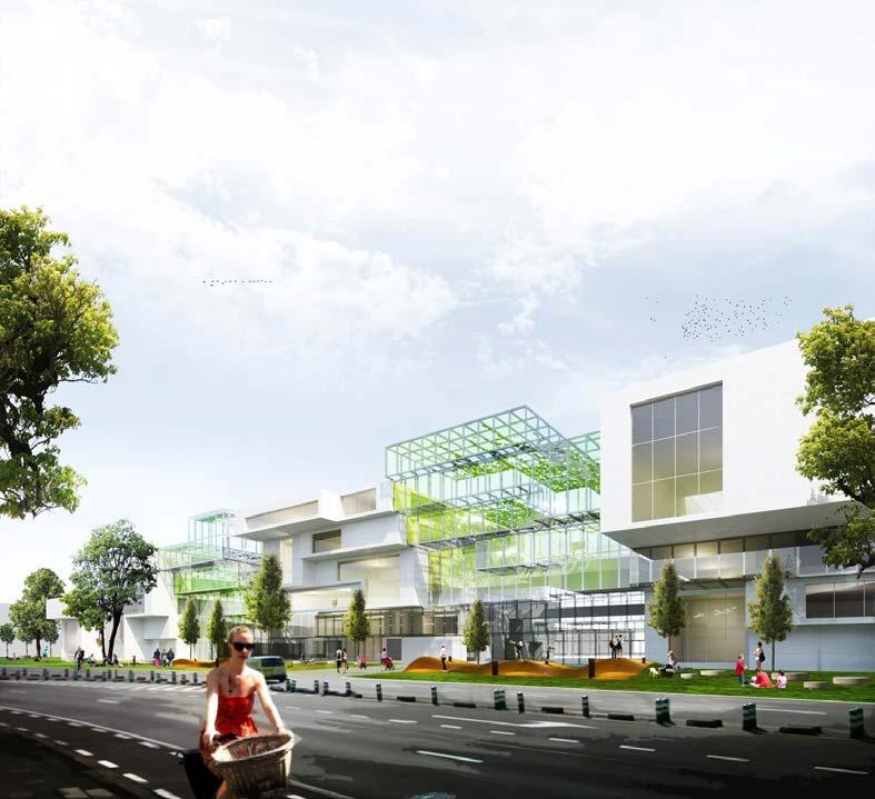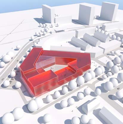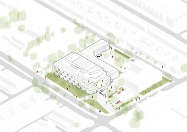 Electrostatic filters therefore supply clean air to the classrooms. This air is drawn into the playgrounds, semi-public spaces that are covered with glass. From here, the clean air flows outward to create better air quality in the public space near the main entrance. The playground is sheltered to create a street canyon effect with clean air. We assume that the form of the building will somewhat prevent the purified air from combining too quickly with the polluted outside air. The aim is to test this concept in a wind tunnel to see whether it really works. In this way, the design provides the possibility for classroom windows to be opened onto the covered semi-public space around the school without letting in particulate matter or soot. Here, opportunities exist for the ‘Frisse Scholen’ program to be combined with passive building. Alongside the abovementioned measures, the entire concept works towards creating an energyneutral and pleasant school building. Additional measures include the application of an algae wall as shading and a bioreactor, a prefabricated timber structure to keep the construction site clean and ensure a comfortable internal climate, and a ‘gaatjesplafond’- a specially perforated, suspended ceiling with hidden fans - for better internal ventilation. Offgassing from building materials and furniture will also be reduced.