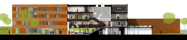 Initial research revealed that situating the sports hall underground would result in the most compact construction volume. This enables the sports hall to be completely integrated with the new building and simultaneously frees up more ground space for outdoor activities. The roof of the sports hall then becomes a podium to stack the different school departments above. On each floor, these departments are connected with the most prominent space and new heart of the school: the assembly hall.
