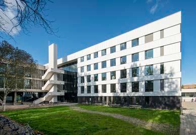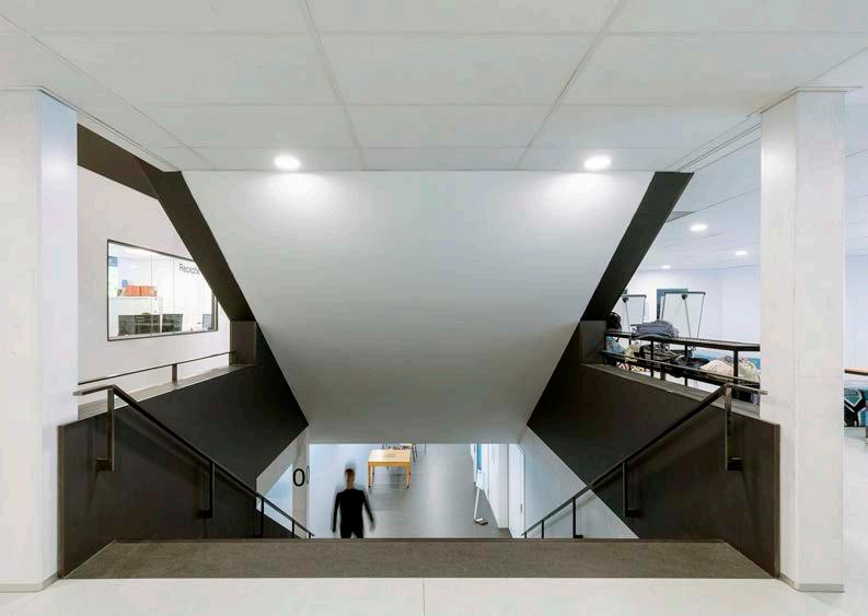 The patios, one of the characteristic elements of the old building, are back in the new building. They bring light deep into the building, provide the opportunity to teach outdoors and refine the scale of the contour, thus matching the grain of the environment.