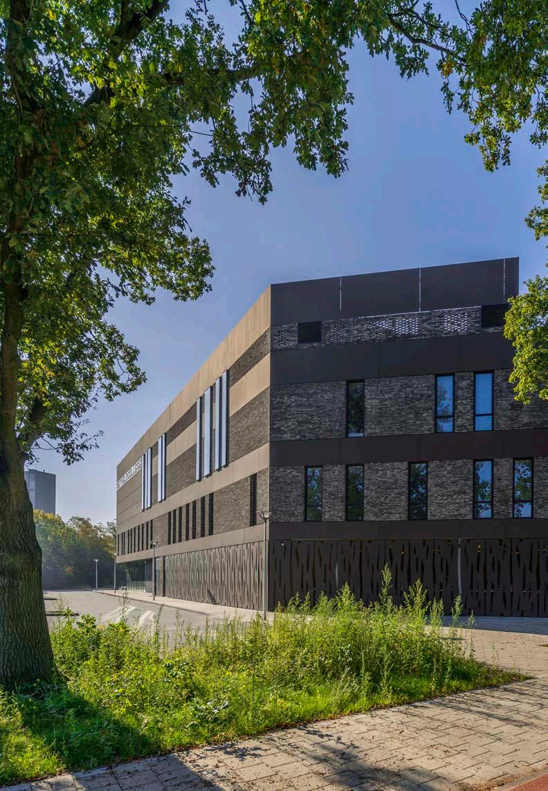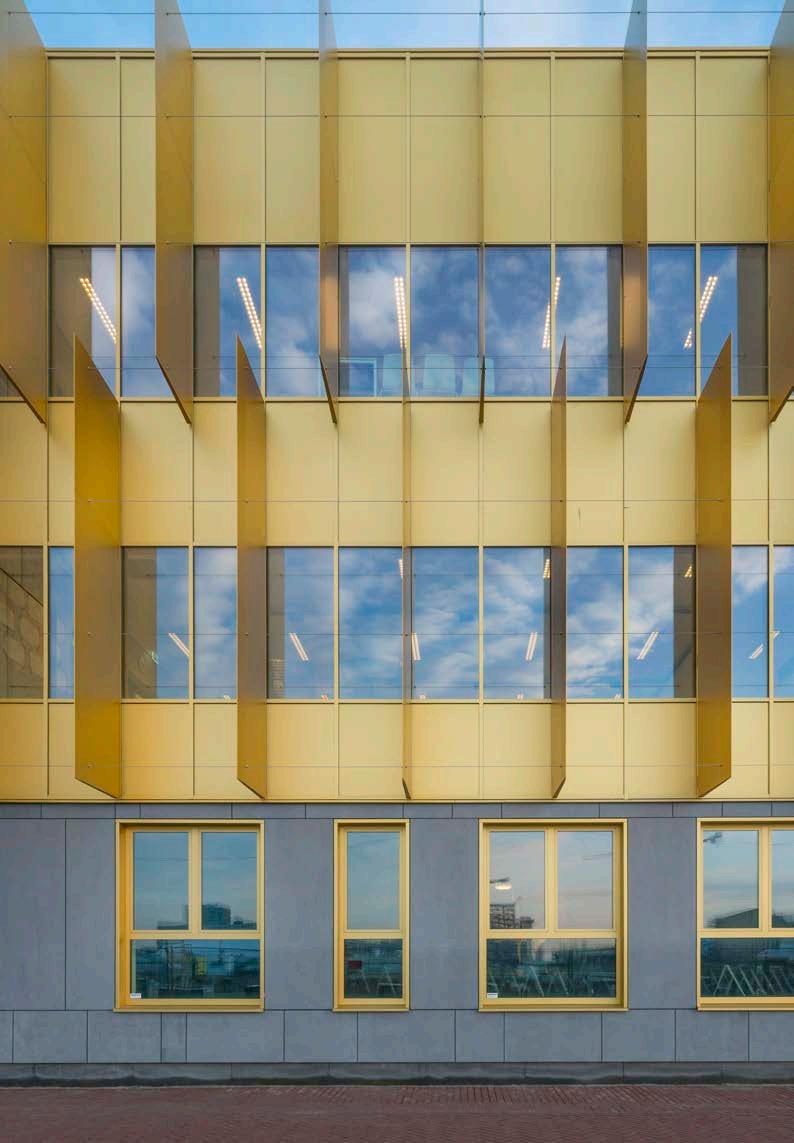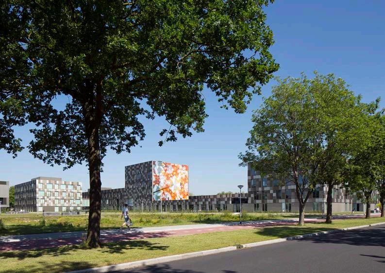 Oriented perpendicular to the railway, the relatively narrow bands of buildings span between Ambachtsweg and Ezingerweg. This horizontal division, which also varies subtly in height, splits the building mass visually into smaller volumes. This connects the buildings better with the smaller scale of the adjacent residential neighbourhood. The integrated complex features a multistorey building called the Hart van Ezinge, which serves as a landmark for the education park.