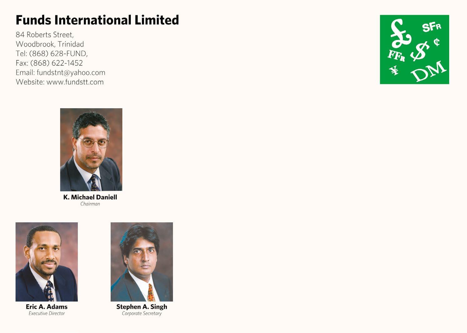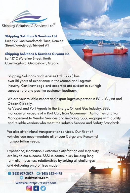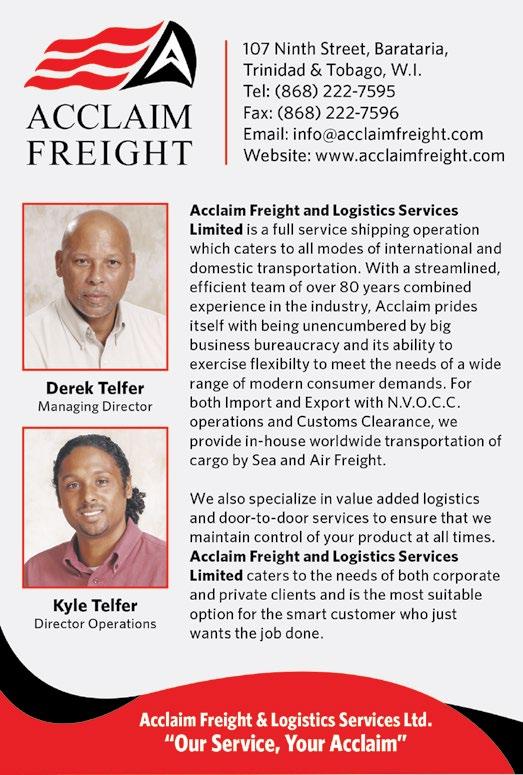 1 On 1 Realty 117 Access Trinidad 109 Acclaim Freight & Logistics Services Limited 126 Advice Financial Company Ltd 24 Aegis Business Solutions Limited 104, 107 Agostini Insurance Brokers Limited 84 Airports Authority of Trinidad & Tobago (AATT) 19 Amaranth Business Solutions Limited 75 American Chamber of Commerce of Trinidad and Tobago (AMCHAM T&T) 10, 14 AMPLIA Communications Ltd 81 Angostura Limited 99 Aon 87 Arima Business Association 16 ASCO Logistics Limited 57 Aspire Fund Management 39 Association of Professional Engineers of Trinidad and Tobago (APETT) 16, 43 Association of Real Estate Agents (AREA) 16, 114, 117 Association of Trinidad and Tobago Insurance Companies (ATTIC) 16 Automotive Dealers Association of Trinidad and Tobago 16 Bankers Association of Trinidad and Tobago (BATT) 16, 41 Beacon 85 Ben Lomond Industrial & Safety Solutions (BLISS) Limited 57 Benca Process and Engineering Solutions Limited 45 Biomedical Enterprises of Trinidad & Tobago Limited 68 bmobile 1, 76, 77, 106 BOSS 101 Broadview Surveillance Systems Ltd 115, 119 C&W Business 72, 73, 74 Capital Signal Company Limited 59 Cardea Benefits Limited 86 Cargo Consolidators Agency Limited 124 Caribbean Agency For Justice Solutions, APEX 70 Caribbean Airlines 3, 20 Caribbean Housing Ltd 116 Caribbean Industrial Research Institute (CARIRI) 65 Caribbean Pardise Real Estate Company Ltd 117 Caribbean Resourcing Solutions 104, 107 Caribbean Information and Credit Rating Services (CariCRIS) Limited 39 Ceejay Engineering Limited 101 Central Bank of Trinidad and Tobago 32 Chaguanas Chamber of Industry and Commerce (CCIC) 11, 14, 15 CIBC FirstCaribbean Financial Centre 30 CIBC FirstCaribbean International Bank 30 Citibank (Trinidad & Tobago) Limited 31 Click Media 97 Compass Realty Limited 117 Concepts and Services 46 Couva/Point Lisas Chamber of Commerce 14 CPRC Realty 117 Cylo Tracking Ltd 23 Digital Broadcast 112 Dufry Trinidad Ltd Inside Front Cover Employers’ Consultative Association of Trinidad and Tobago (ECA) 13, 16 Engineering Associates Limited 100 Environmental Management Authority (EMA) 61 EPL Properties Limited 120 Errol Jaglal Real estate 117 European Business Chamber in Trinidad and Tobago 14 Eve Anderson Recruitment 104, 107 Export - Import Bank of Trinidad & Tobago (EXIMBANK) Ltd. 25, 33 Fair Deal Real Estate 117 Farah Insurance Brokers Ltd 92 Fintech Association of Trinidad & Tobago (FINTECHTT) 16 First Citizens 26, 27 Firstline Securities Limited 34 Flow Business 72, 73, 74 Funds International Limited 40 Furness Anchorage General Insurance 92 Furness Chemicals 92 Furness City Park 92 Furness Group of Companies 92 Furness Investments 92 Furness Properties 92 Furness Rentals 92 Furness Shipping & Marketing 92 Furness Trinidad 92 Genesis Insurance Brokers & Benefits Consultants Ltd 87 GISCAD Limited 45 GoodHealth Medical Centre 68 Grant Thornton ORBIT Solutions Limited 5 Guardian Group 88, 91 Guardian Group Shared Services 82 Happi Products Limited 102 Hardware & Beyond 119 Health City Cayman Islands 62, 63, 64 HHSL Safety Systems Limited 51 Hot-Hed Trinidad Ltd 58 Institute of Banking and Finance of Trinidad and Tobago (IBF) 16, 40 InvesTT 95 Island Finance Trinidad and Tobago 35 Issa Nicholas Holdings Limited 118 KC Candy 103 KCL Capital Market Brokers Limited 41 Kalloo’s Holdings Ltd. 23 Key West Limited 117 La Brea Industrial Development Company Limited (LABIDCO) 56 Lennox H. Sealy & Associates Ltd 111 LH Group 96, 97 Lifestyle Motors Limited 22 Lennox H. Sealy & Associates (LSA) Ltd 111 Massy Gas Products Limited 59 Massy Motors 21 Massy Wood Ltd. 52 Medcorp Limited 60, 67, 68, 69 Ministry of Trade and Industry 8 NAGICO Group 89 NAGICO Holdings Limited 89 National Agricultural Marketing and Development Corporation (NAMDEVCO) 98 National Energy Corporation of Trinidad and Tobago Limited (National Energy) 56 National Helicopter Services Limited (NHSL) 23 NCB Merchant Bank (Trinidad and Tobago) Limited 36 NEM Leadership Consultants 111 NGC CNG Company Limited (NGC CNG) 56 Norstrom 117 O.J.’s Electrical & Instrumentation Services Limited 46 Offshore Innovators Ltd. 50 Operation Hope - Touching Lives 119 Origin Caribbean Real Estate and Investment Services 121 ORIGITEK Solutions Limited 47 Pan American Life 90 Index by Company 135