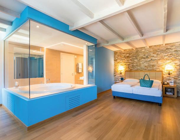 Gäste können in der neuen ACQUA SUITE in die Entspannung eintauchen und den Geist erfrischen. In der lichtdurchfluteten, 46 Quadratmeter grossen Suite harmonieren die Wände in Blautönen mit Stein und Holz. Im Zentrum steht die grosse, in Blau gehaltene Whirlpool-Badewanne. Sie lädt zu einem Sprudelbad mit Farbtherapie ein, während die Augen ins Grüne blicken, hinaus zum Garten und den Bäumen. Die Energie und Kraft des fliessenden Wassers geniessen die Gäste wiederum unter der grossen, deckenmontierten blauen Regendusche.