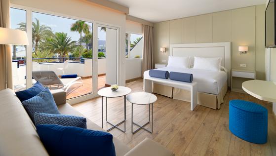 Spacious twin rooms (photo opposite), have a small lounge area and Fuerteventura views, Marina Rubicon, Papagayo beaches and pool and garden views. Larger junior suites, pool view, and one bedroom suites with a separate living room, a separate shower and a hydro-massage bath. Some rooms inter-connect. Family rooms accommodate two adults and two children. Late check-out for all Prestige Travel guests (subject to availability).