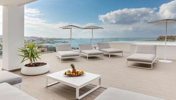 Two outdoor heated pools and two children’s splash pools. Just over the road, is Activate Sports Club open to hotel guests and the public, with free open-air gym and free classes. Man-made beach area, Fuel RestoBar. Baobab Wellness offers treatments and massages. Mini-club (open daily) for three to 12 year olds. Free private transfer to El Duque beach once per day. Breakfast buffet and à la carte dinner at restaurant Bite, or order your breakfast items to prepare in your own suite. BB Restaurant offers lunch and dinner options and snacks. Sucás Restaurant for innovative dishes.